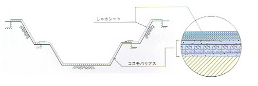 廃棄物埋立処理場まで、使用されているしゃ水シートと新開発の漏水感応型自己遮水材・コスモバリアスを併用する信頼性の高い遮水工法です。