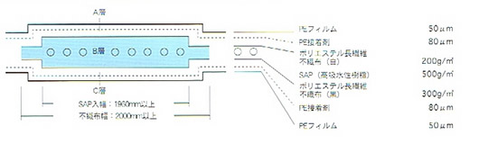 ポリエステル長繊維不織布東レ”マントル”に、ポリエチレン樹脂をコーティングし、高級水性樹脂を間に閉じ込める事により吸水時のポリマーの成長(高級水樹脂の吸水・膨潤)が抑制され、ポリマー自体が不織布間で相互に強く密着する事になります。