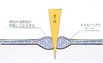 しゃ水シートを鉄筋などが貫通した場合、高吸収水性樹脂が膨潤して、貫入物の周りをシールする形で遮水します。