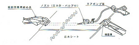 検査治具:透明窓に設けた真空容器で、遮水シートとの接触部は漏触部は漏気がないもの。圧力計を有すること。